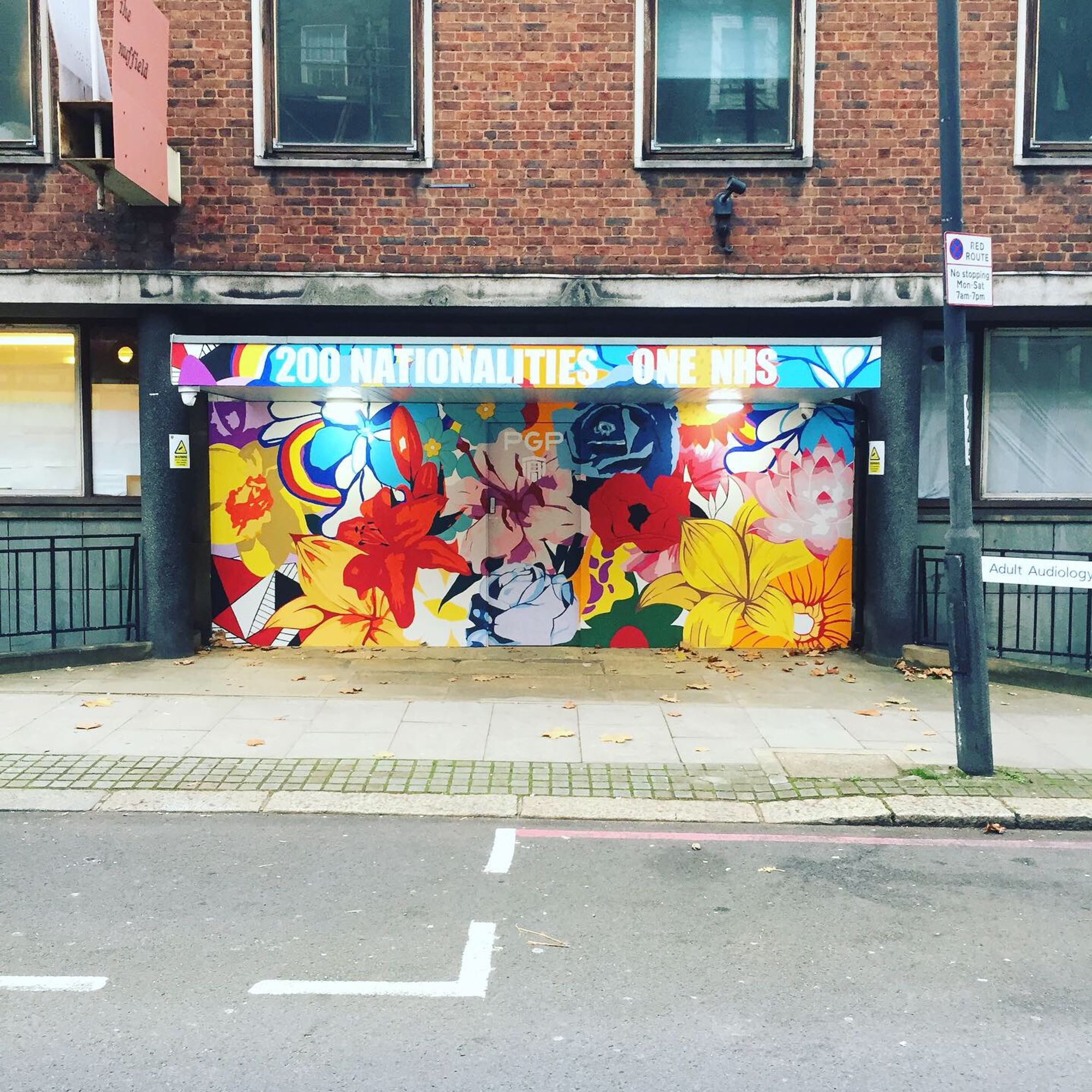 The project is a continuation of the “200 Nationalities, 1 NHS” campaign started with organisation Paint the Change. The front entrance and reception hall get a total make over with a blast of flowers that invade and transform the space.