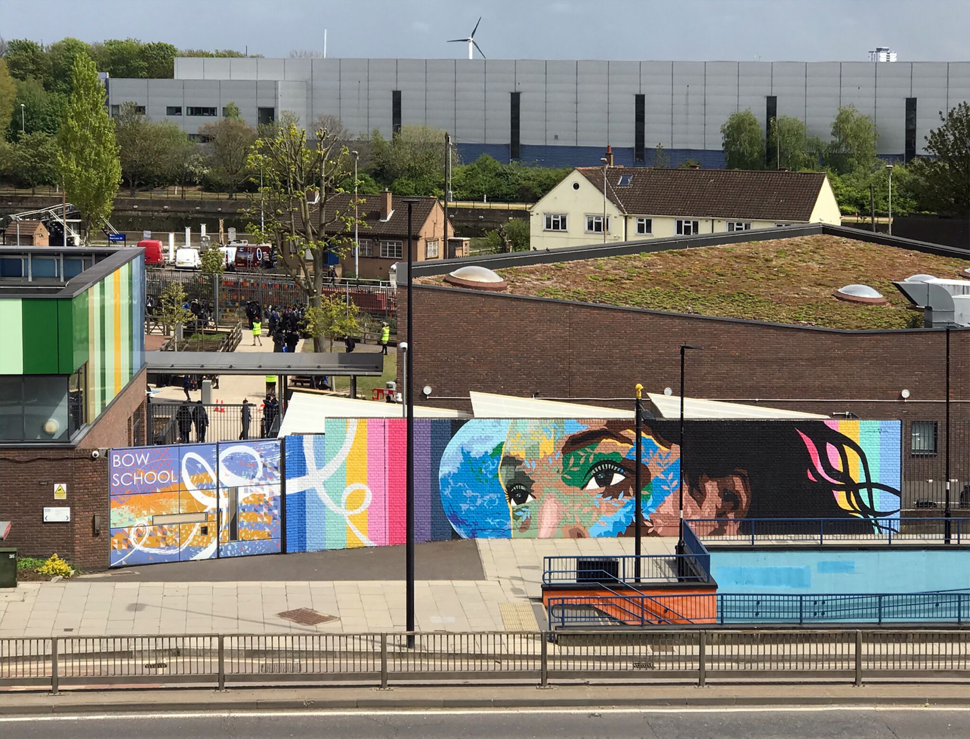 Large mural project with Bow School / Paint The Change to celebrate Earth Day. Visible on the A12, London.