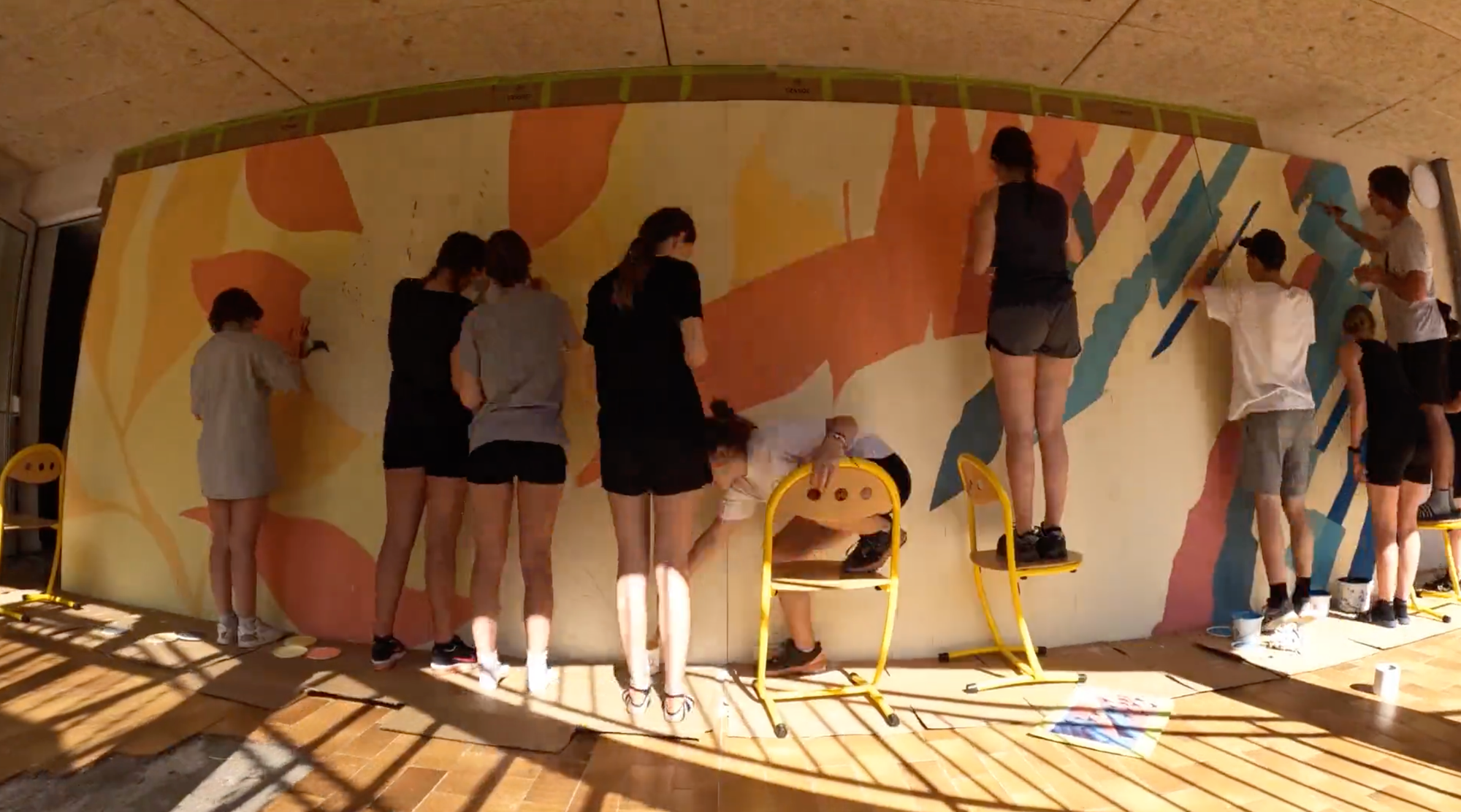 Yoga session before mural painting. 120 young people took part in the making of it during their SNU, and got to dance the night away with the band Des clochettes dans les pieds.