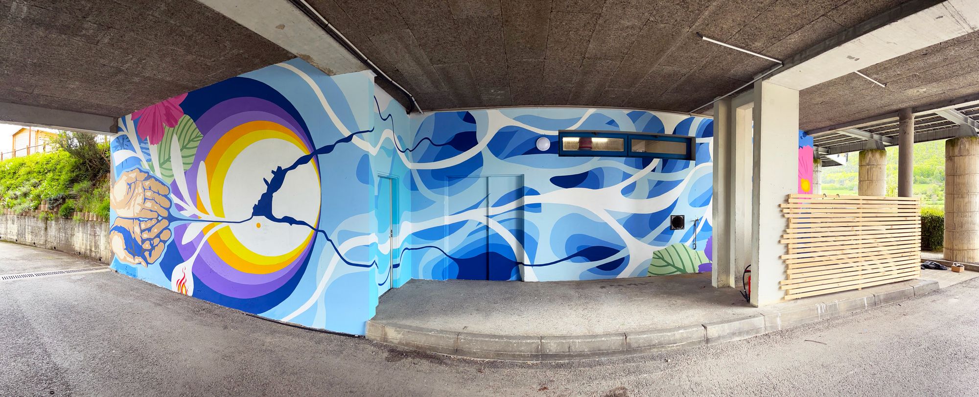 Located near by the largest human made lac in Europe, this mural highlights the circuit of water. Painted with 150 young volunteers.
