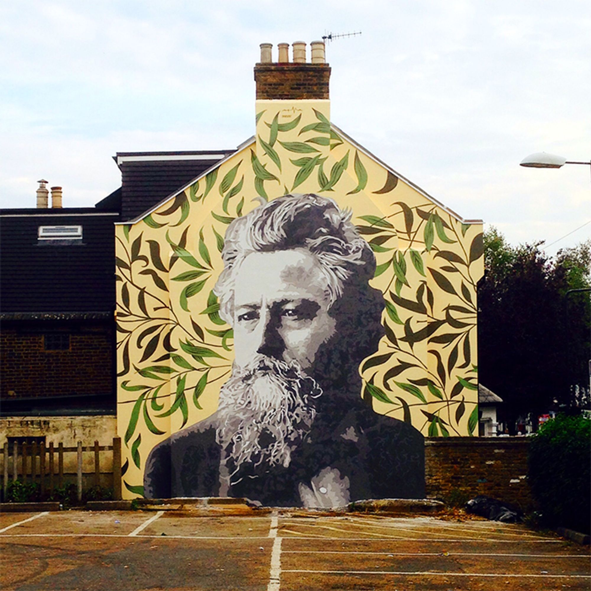 A mural celebrating William Morris adjacent to the William Morris Gallery in London.