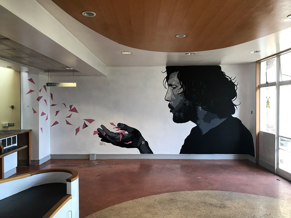 The project is a continuation of the “200 Nationalities, 1 NHS” campaign started with organisation Paint the Change. The front entrance and reception hall get a total make over with a blast of flowers that invade and transform the space.