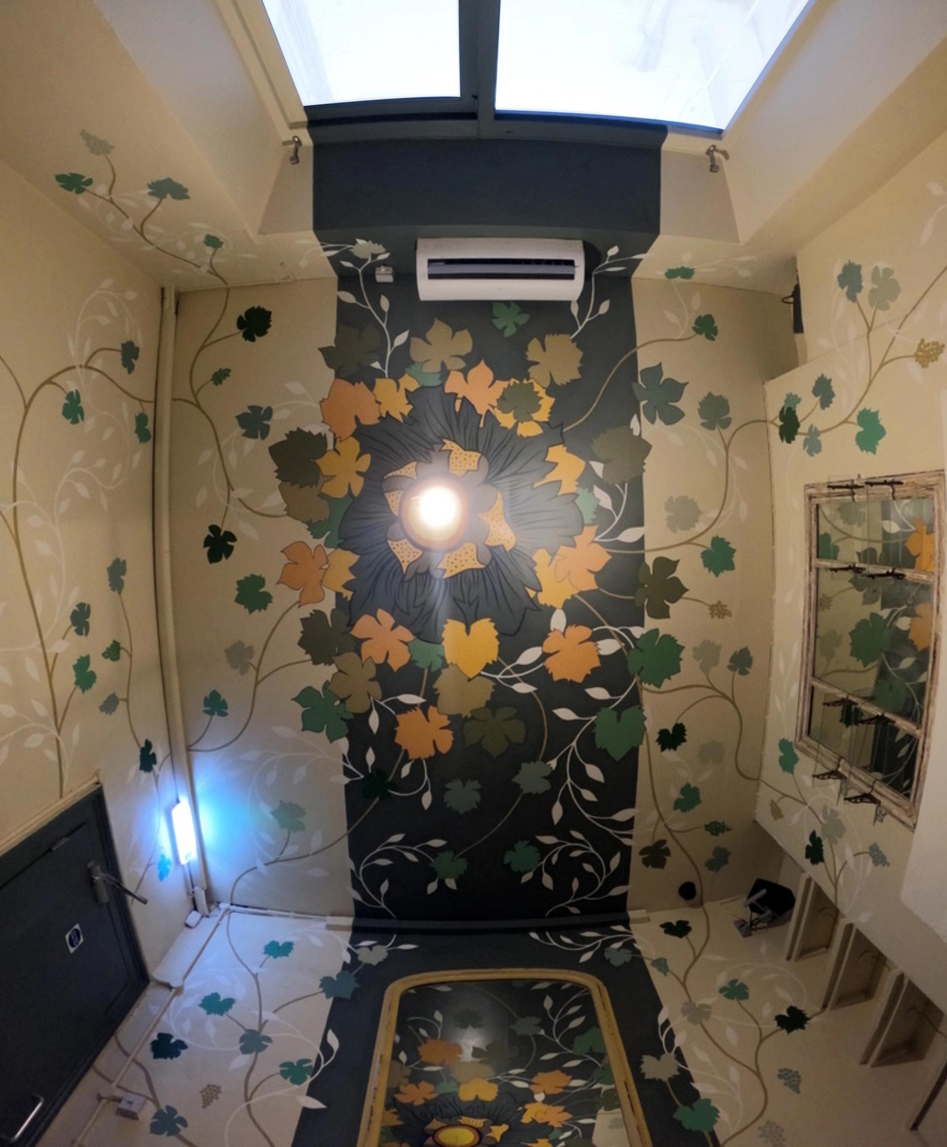 The vine, taking in roots in Clay soil, grows across the room, made of the 3 Champagne cépages (Pinot Noir, Sauvignon Blanc, Meunier) and reaches out the ceiling light as an explosion of taste.