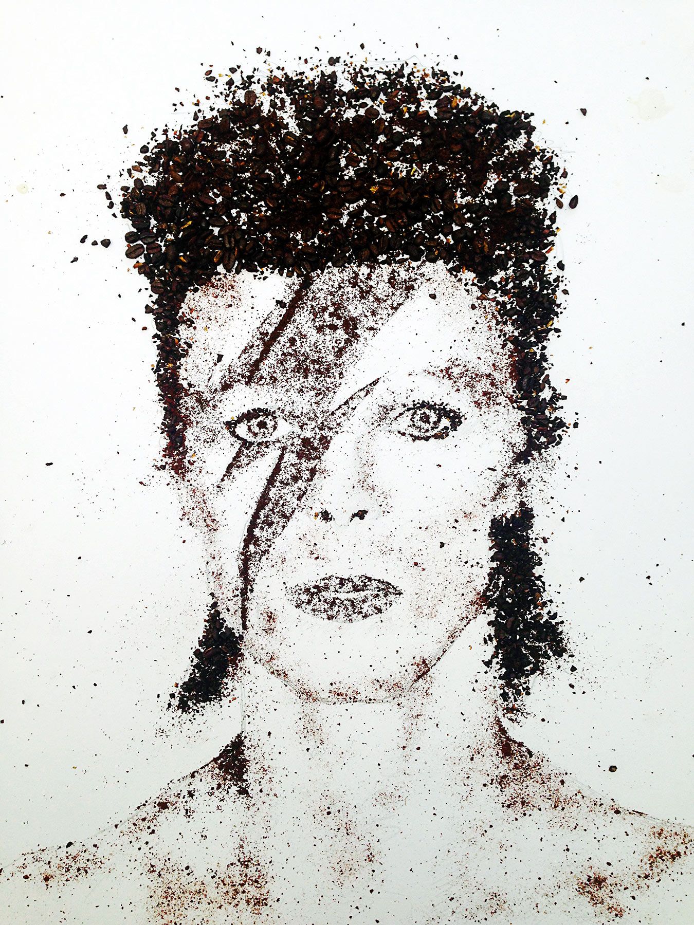 Coffee portraits of influential Londoners: Adele, Sadiq Khan, Mo farah, Prince Charles, and the late David Bowie.