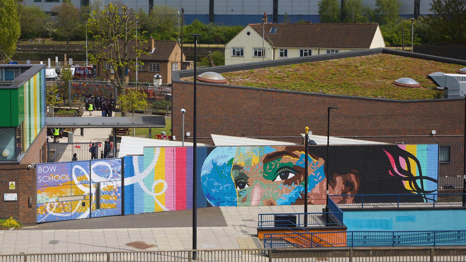 Large mural project with Bow School / Paint The Change to celebrate Earth Day. Visible on the A12, London.