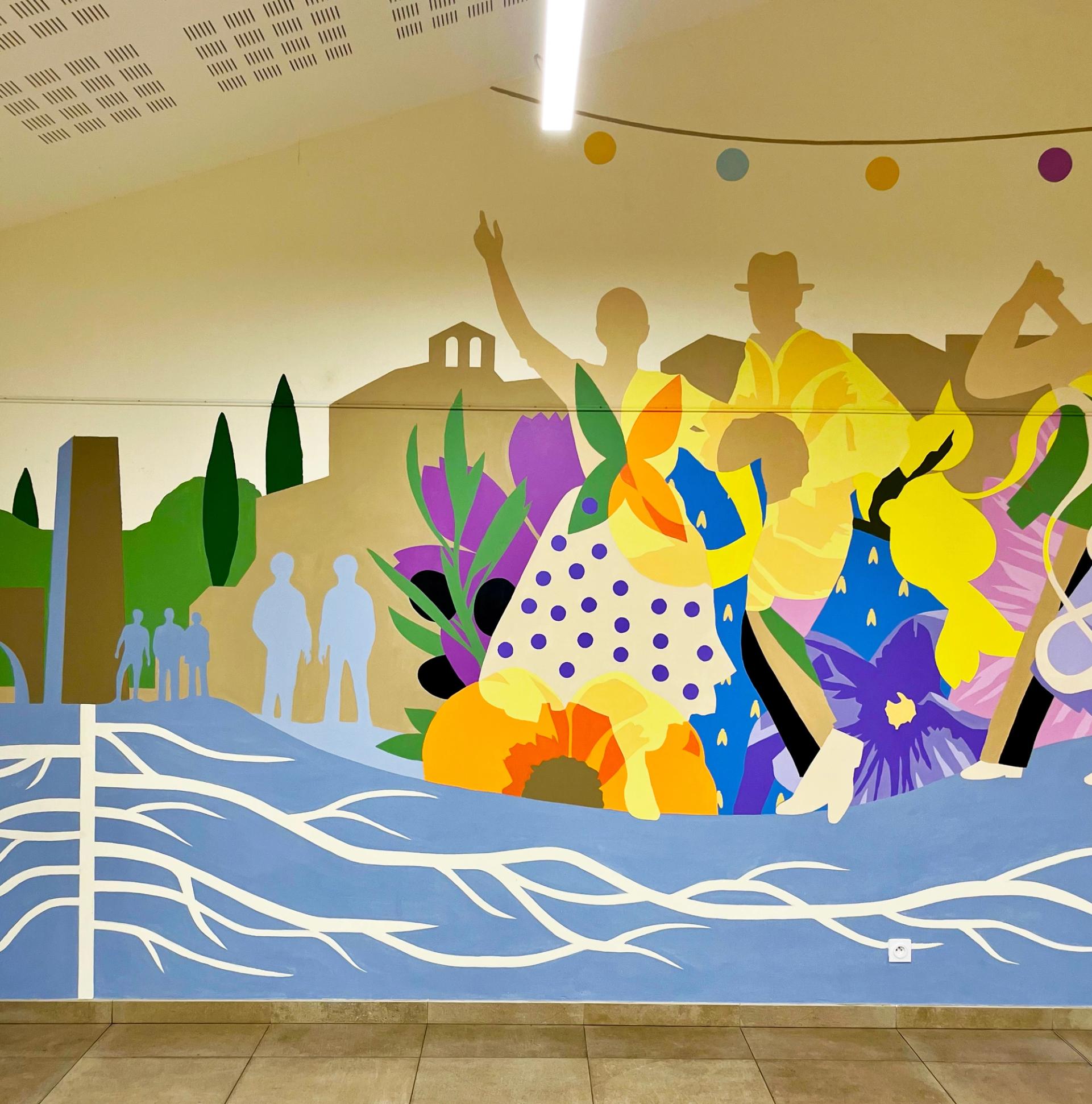 Community mural celebrating the mining past, joyful present and hopeful future of Sigonce, Provence, France.
