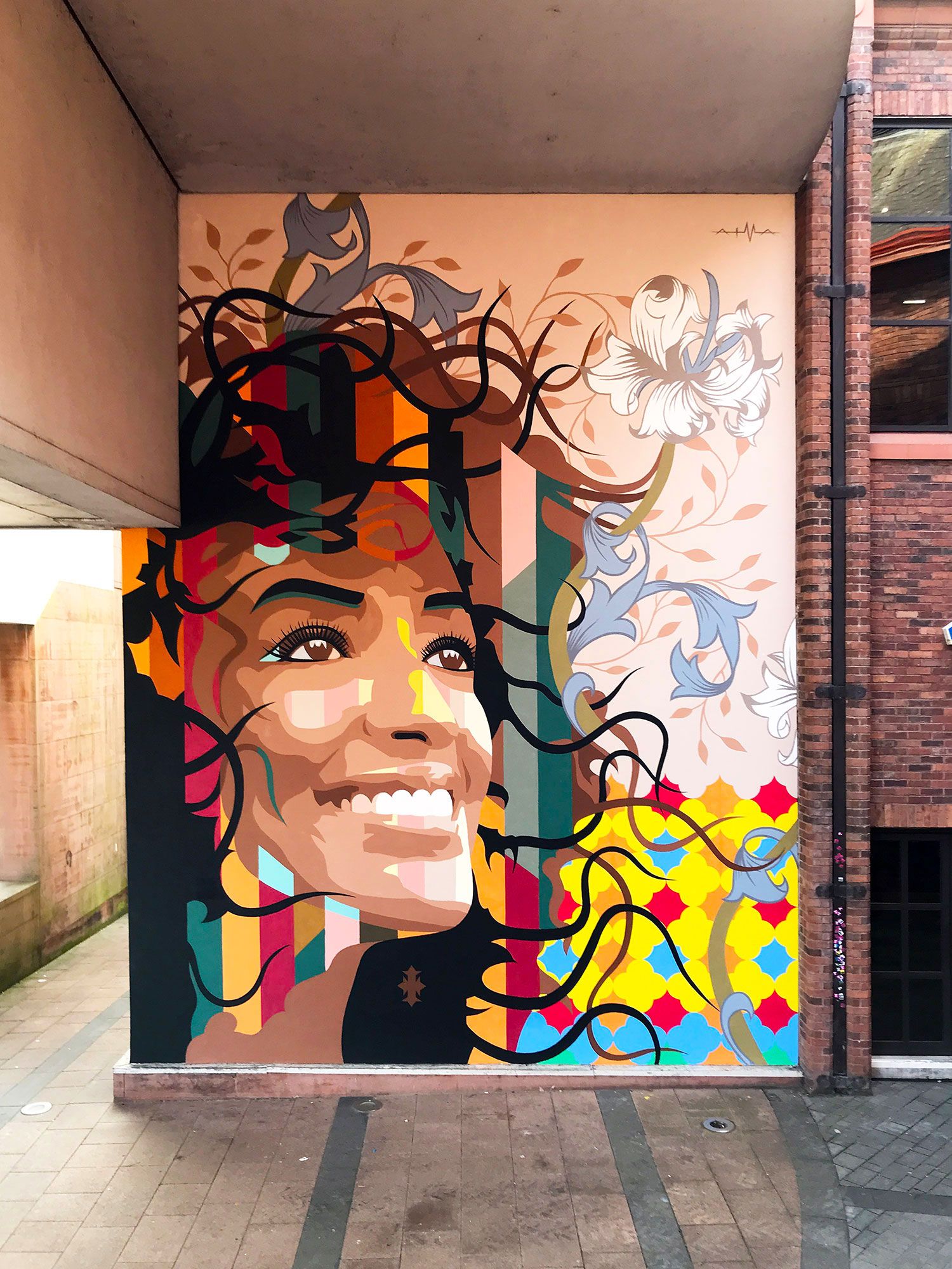 Major outreach & mural project for Cumbria's largest museum & home of culture. Starting out with 4 days of workshops, the design includes and celebrates cultural patterns created by the participants - refugees and asylum seekers, who also took part in the actual painting of this gigantic piece.