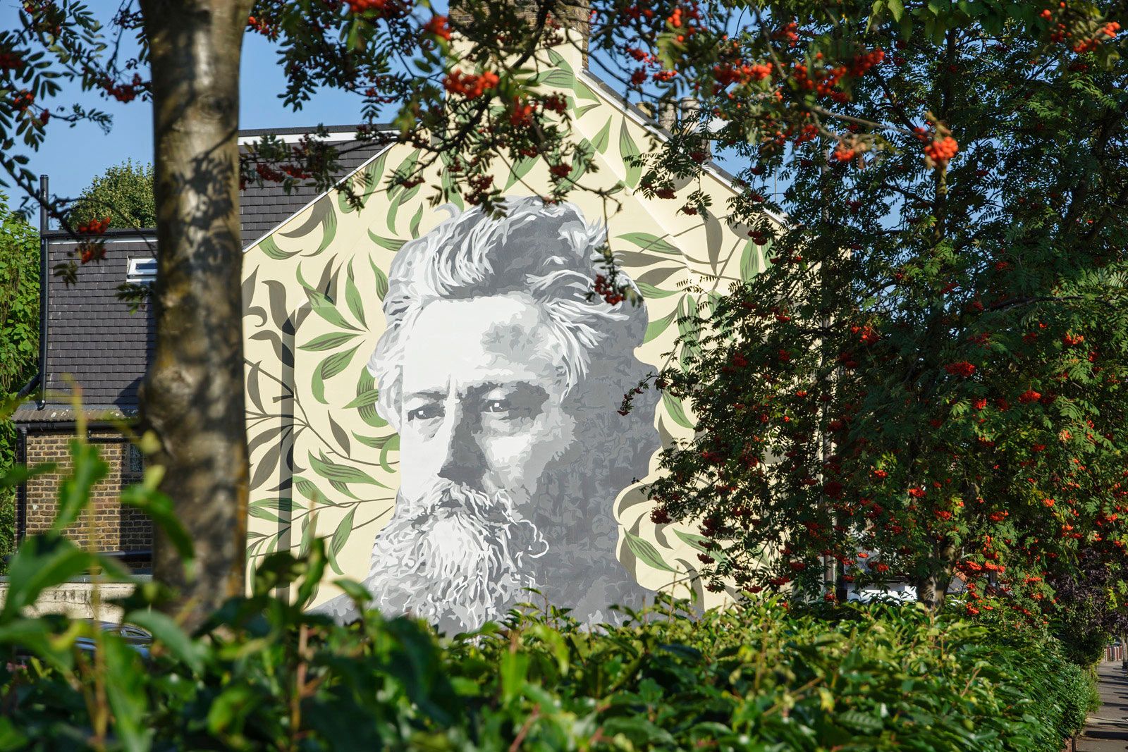 A mural celebrating William Morris adjacent to the William Morris Gallery in London.